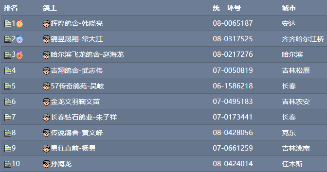 季军哈尔滨飞龙鸽舍-赵海龙,赛鸽环号08-0217276,归巢时间07:13:25,分速1236.857米/分。