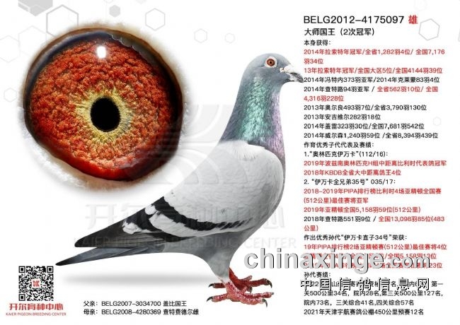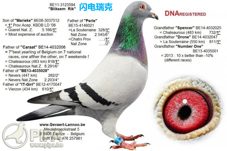 母亲“卡拉特亲姐妹”出自“闪电瑞克”X“红全国雌”,其中“闪电瑞克”为瑞克.库尔斯的全省长距离鸽王冠军“玛莉卡”的直子,也是盖比“闪电号”直孙。而“红全国雌”则是马克.迪库克的顶级品质种雌,出自利蒙治大区冠军“红全国”X亚精顿全国16位。