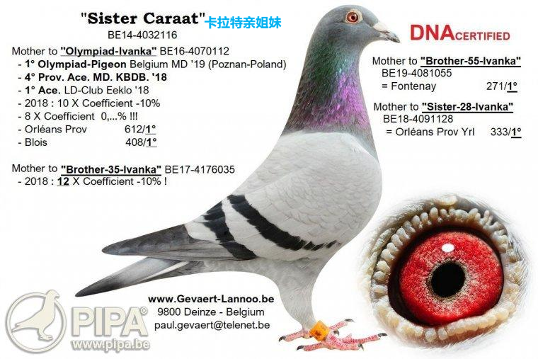 “奥林匹克伊万卡”(环号BELG2016-4070112)的竞赛生涯堪称完美:10次参赛全部跻身前10%,8次闯入前1%,一举斩获2019年奥林匹克比利时中距离代表鸽冠军。它是吉瓦特.兰努最爱的赛雌之一,邢总87万引进的铭鸽。