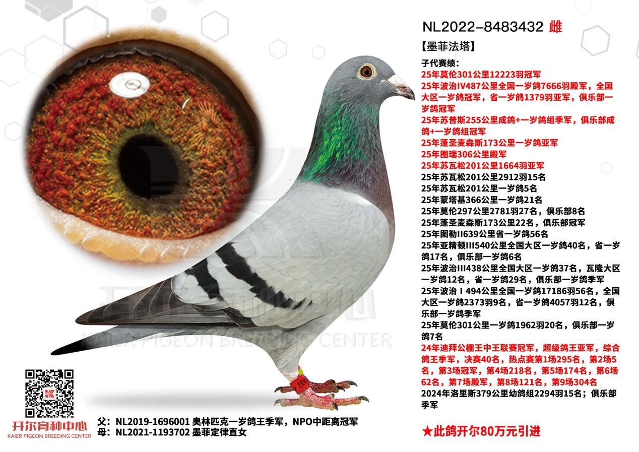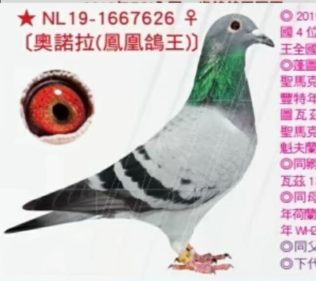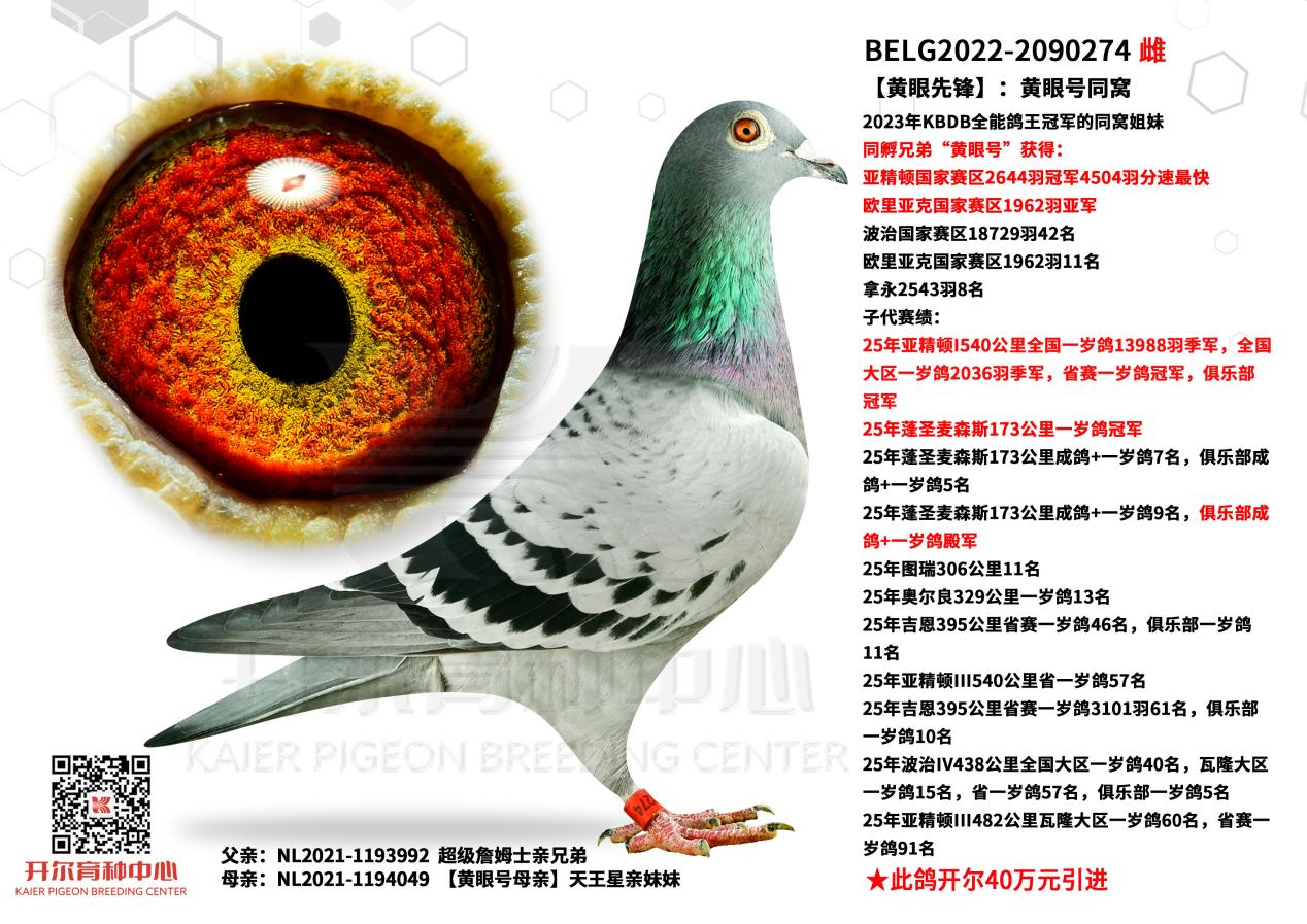 母亲为KBDB全能鸽王冠军黄眼号的同窝姐妹,黄眼先锋,源自超级詹姆士与天王星亲妹妹的结合。黄眼先锋作育子代闪耀25欧赛,先后在蓬圣麦森斯赛场斩获冠军、7名、9名,并豪夺25年亚精顿I540公里全国一岁鸽13988羽季军。