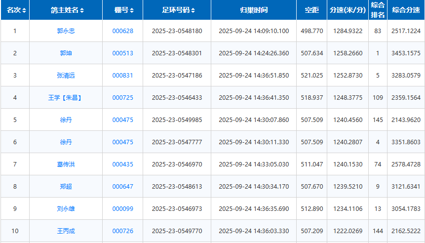 下午14点09分10秒,冠军归巢!来自郭永忠的2025-23-0548180赛鸽,以1284.9322米/分的速度夺魁。郭坤的2025-23-0548301赛鸽,以1258.2660米/分的成绩摘得亚军,值得一提的是,该羽赛鸽凭借稳定出色的综合表现,同时斩获本届赛事鸽王冠军头衔。季军由张清远的 2025-23-0547186获得,平均分速为1252.8730米/分。