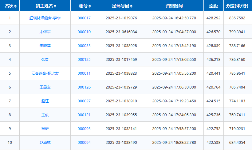 下午16点42分50秒,迎来首羽归巢鸽。虹塔林泽鸽舍-李华的2025-23-1039076率先冲线,以836.7592米/分的速度荣膺冠军。宋华军的2025-23-0616084摘下亚军,平均分速799.3941米/分。李晓萍的2025-23-1038928获得季军,平均分速788.7166米/分。