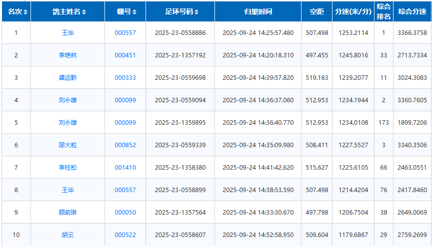 下午14点25分57秒,王华的2025-23-0558886赛鸽率先归来,以1253.2114米/分的成绩夺冠。据悉,这羽冠军同时揽获鸽王冠军,成绩亮眼。李艳林的2025-23-1357192赛鸽拿下亚军,平均分速1245.8016米/分。龚运黔的2025-23-0559698赛鸽则摘得季军,平均分速1239.2077米/分。