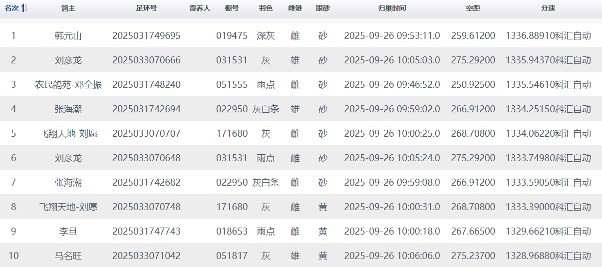 经过三个多小时的等待,小将们陆续归来。来自韩元山鸽友的2025031749695砂眼深灰雌拔得头筹,平均分速1336.8891米/分。刘彦龙2025033070666砂眼灰雄拿下亚军,农民鸽苑-邓全振的2025031748240砂眼雨点雌则获得季军。