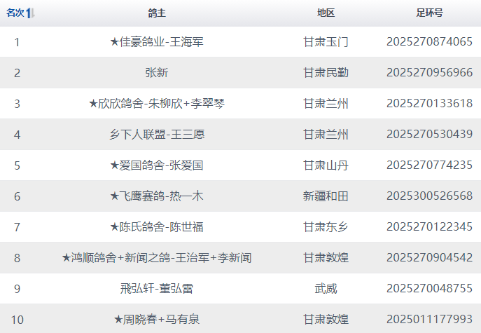 目前,甘肃省的秋赛仍处在初始阶段,除羽佳禽、诚翔两家公棚外,甘肃渭源浩峰信鸽公棚于9月23日完成了收费站挑战、五合生生赛鸽园于9月25日完成收费站。其他大部分秋棚依旧在路训状态,相信不久的将来,会有大部分公棚迎头赶上,正式开启秋赛节奏。