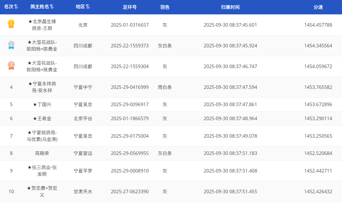 一小时左右,大批赛鸽归巢落台。获得冠军的是北京晶生缘鸽舍-王朋鸽友,足环号2025-01-0316657,羽色灰,分速1454.4578米/分。亚季军则由来自四川成都的鸽友大雪花战队-欧阳杨+陈勇全包揽,亚军鸽足环号2025-22-1559373,分速1454.3455米/分,羽色灰白条;季军鸽足环号2025-22-1559304,分速1454.0596米/分,羽色灰色。