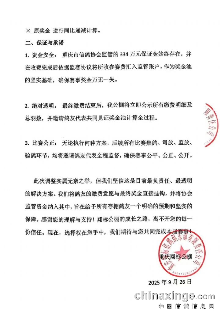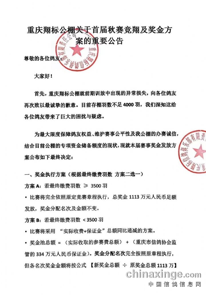 9月26日,重庆翔标公棚发布《关于首届秋赛竞翔及奖金方案的重要公告》。公告中说明“因前期训放中出现的异常损失……目前存棚羽数不足4000羽。依据缴费羽数是否达到3500羽,公棚推出两个奖金执行方案”。