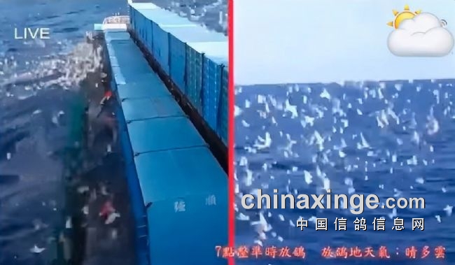 当日天气晴转多云,东南风5级,海面小至中浪,水温达30℃,最高气温29℃。随着放飞指令下达,赛鸽迎着朝阳,在碧海蓝天间划出一道道银色轨迹,场面恢弘,气势如虹。
