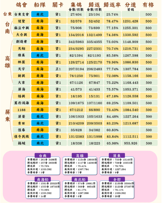 经过激烈角逐,赛事交出亮眼答卷:总计2124舍、27394羽赛鸽成功归巢,整体归巢率高达76.13%。其中,高雄旗美鸽会表现尤为突出,归巢率达85.58%。冠军殊荣则由台南大合兴鸽会摘得,单关最高分速1330.592米/分。