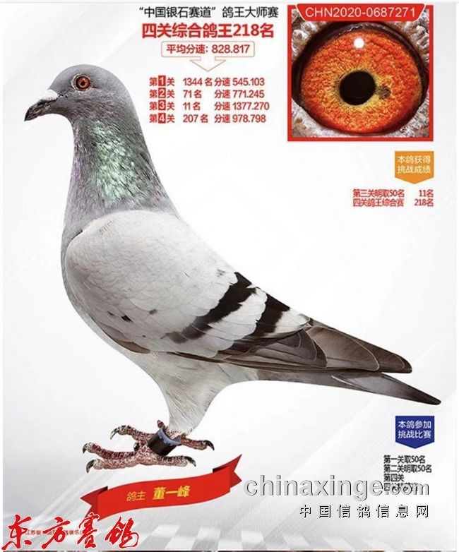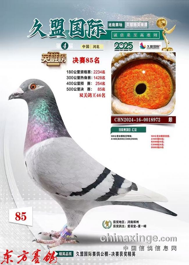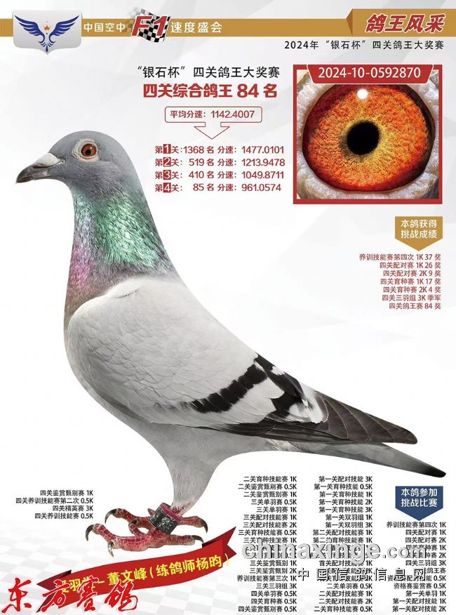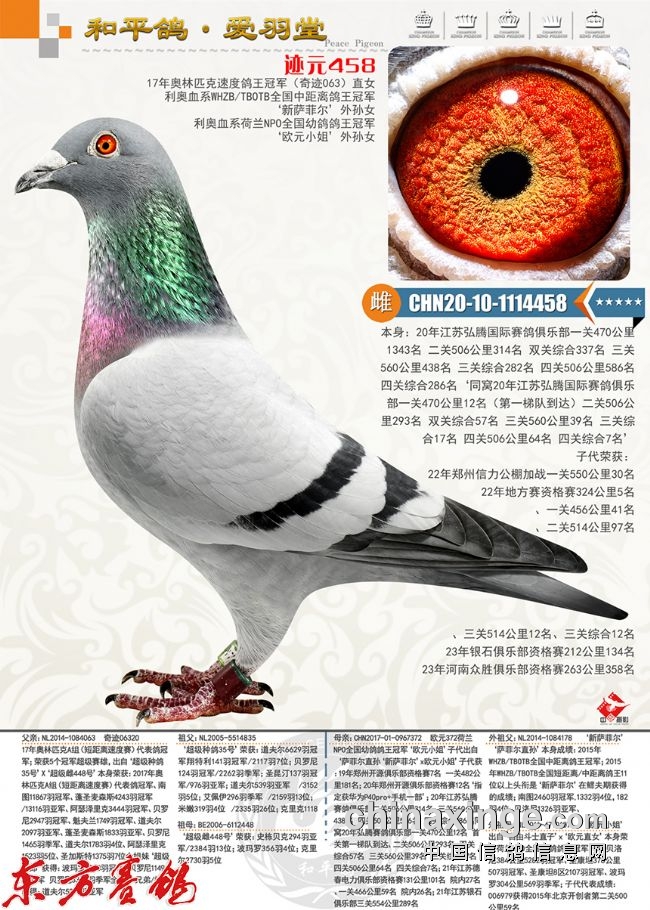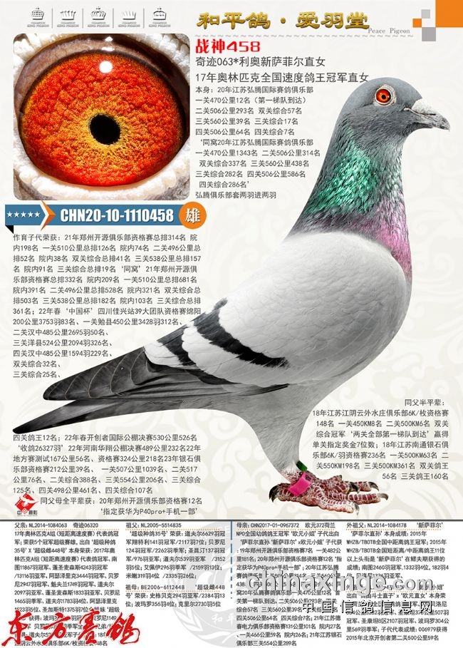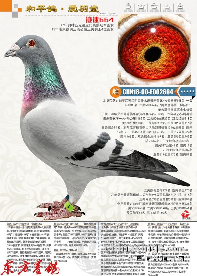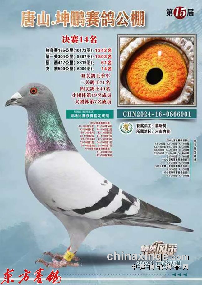 支援鸽友姜昕吴荣获唐山坤鹏公棚14名、双关鸽王季军;是外援奇迹063后代做出的。