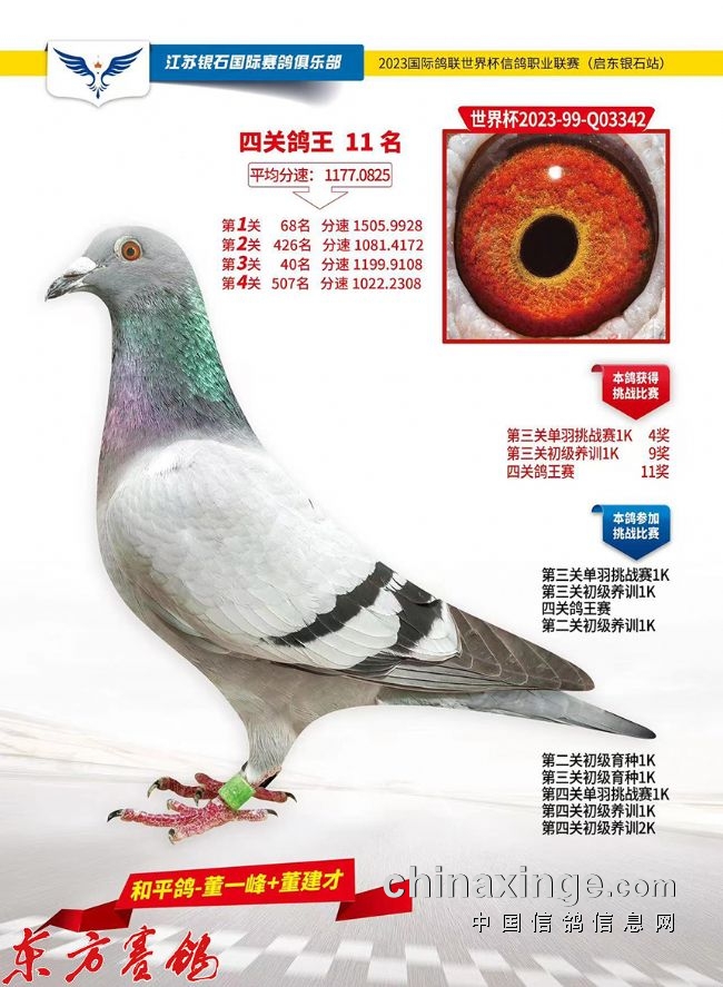江苏银石俱乐部四关综合鸽王:11、33、64、107、150、388名。