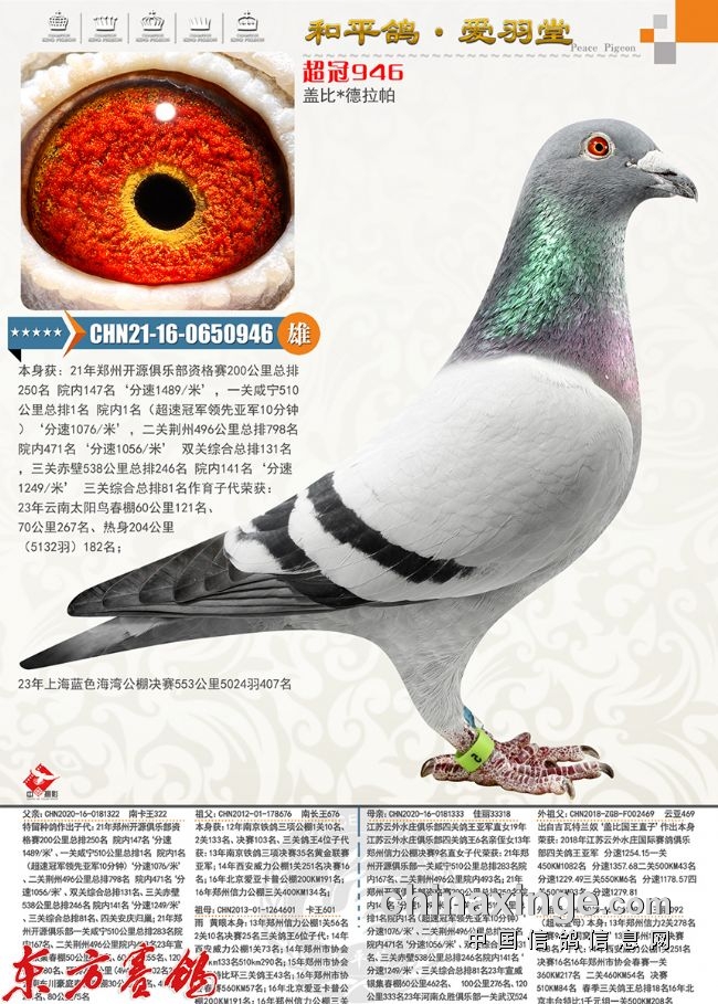 2021年支援鸽友:鸿翔闪电-张玉钢荣获2021年建业公棚决赛111名;郑州铂森公棚(春棚)2022年春季加站赛双关鸽王41名,决赛565名和加站赛99名,决赛540名;荣获2023年郑州晟森赛鸽公棚决赛亚军、69名。荣获2024年山东风帆赛鸽公棚(秋棚)决赛85名。建业公棚决赛111名;