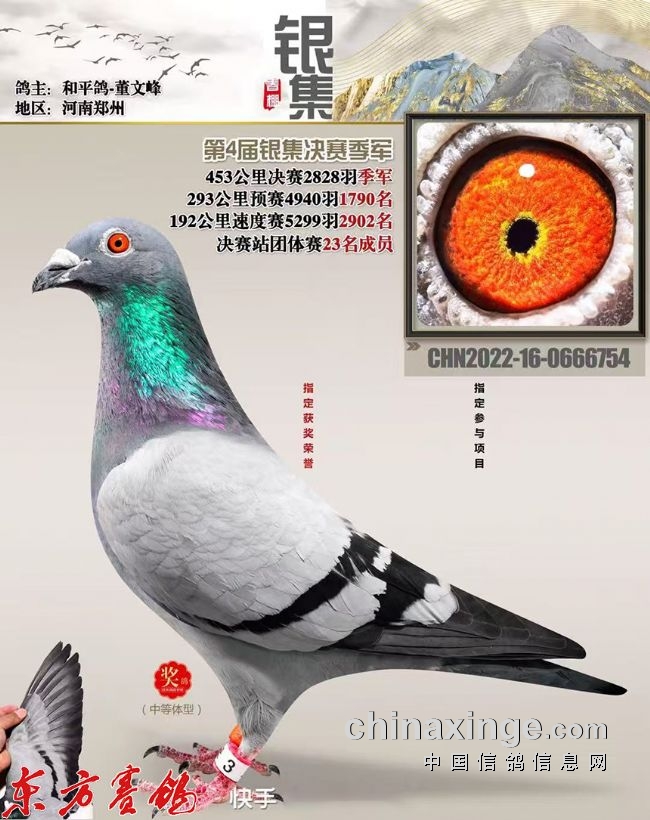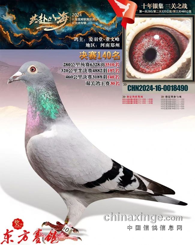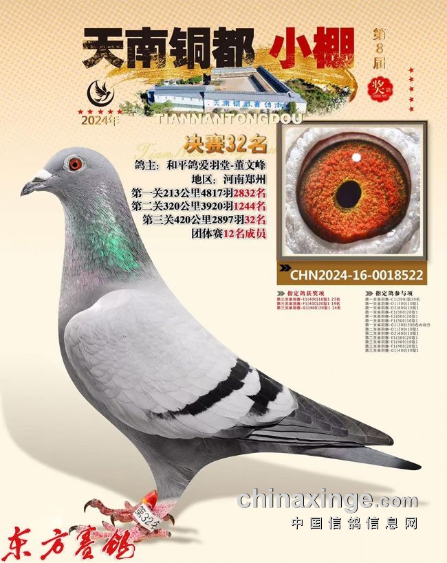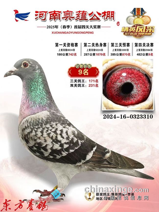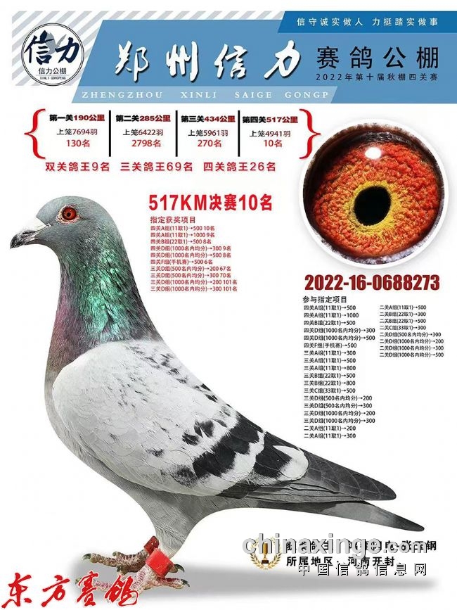 郑州信力公棚500KM决赛44、55、74、306、371、474名;名人赛冠军,三关鸽王16名
