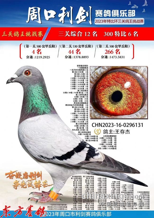 支援鸽友王存杰荣获2023年周口市利剑赛鸽俱乐部三关综鸽鸽王12名,获19项技能赛冠军。