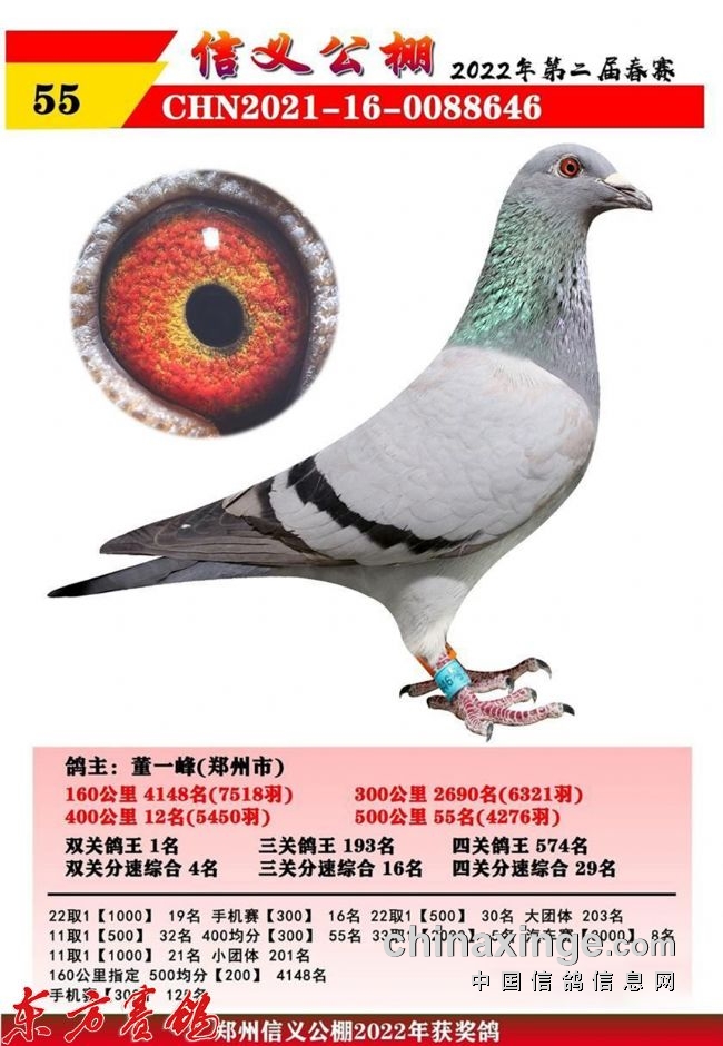 郑州信义春棚500公里决赛55名、双关鸽王冠军