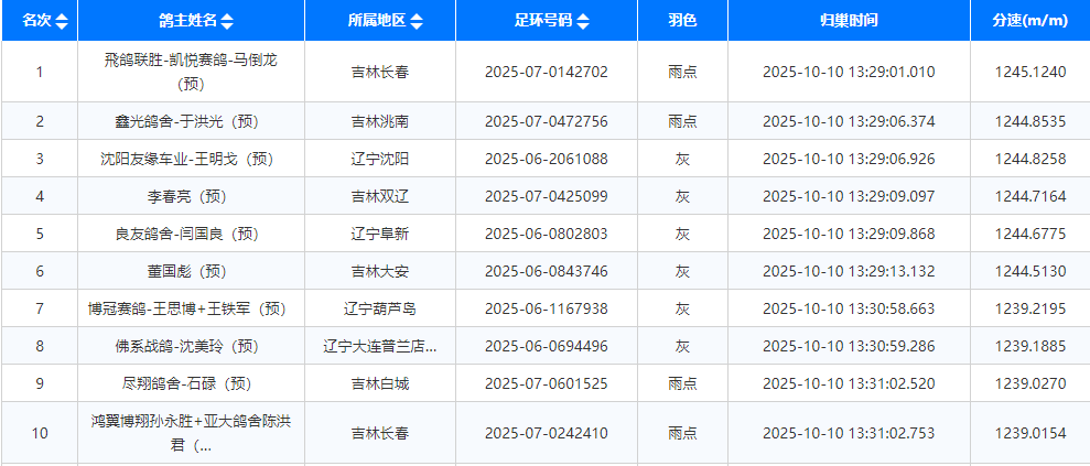 冠军:飛鸽联胜-凯悦赛鸽-马倒龙,来自吉林长春,其名下一羽2025-07-0142702,于13时29分01秒报进,羽色雨点,分速1245.1240米/分,斩获本次决赛冠军!