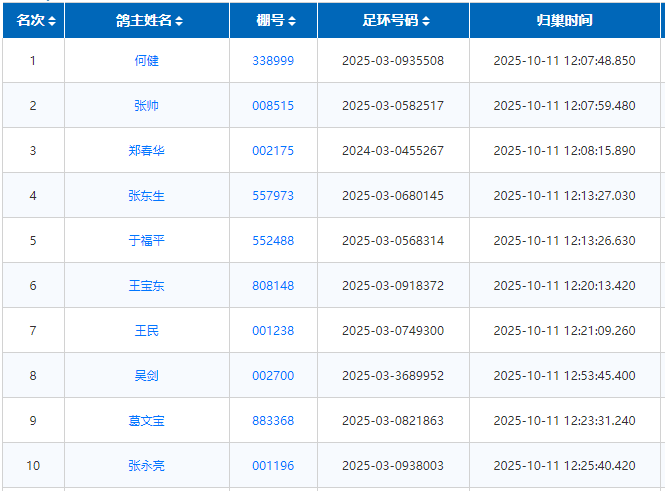 归巢情况:12点左右,赛鸽开始归巢。这是一场顺风大赛,冠军分速达到1642米/分,成绩喜人。以下是详细赛况: