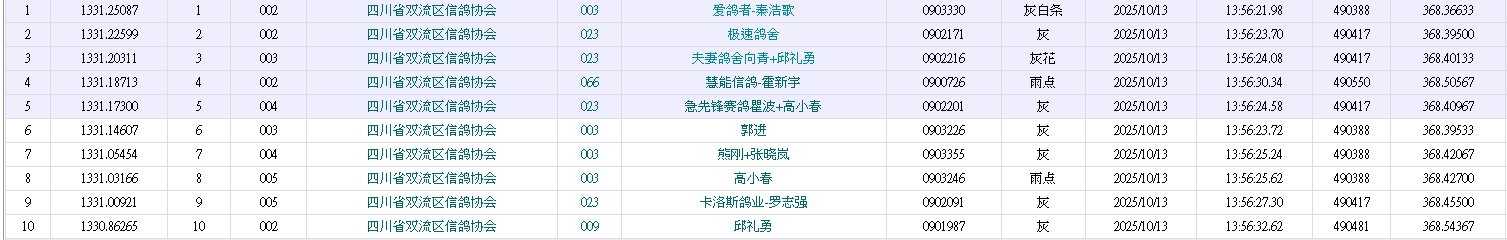 13点56分,迎来首批归巢小队。重庆名家爱鸽者-秦浩歌名下0903330灰白条一举夺魁,平均分速1331.2508米/分,飞行空距490.388公里。极速鸽舍的0902171灰鸽紧随其后,以1331.2259米/分的速度拿下亚军,季军则由夫妻鸽舍向青+邱礼勇的0902216灰花夺得,平均分速1331.2031米/分。名家争先,本场比赛亮点多多。