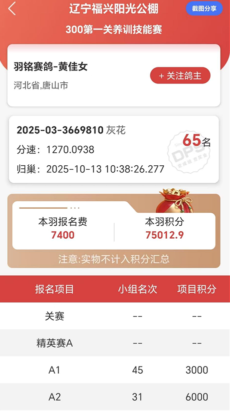 恭喜鸽友黄佳女斩获福兴阳光首关65名!吉尔特海伦在助力鸽友超越公棚斩获亚军之后,再度让鸽友登上高光时刻。