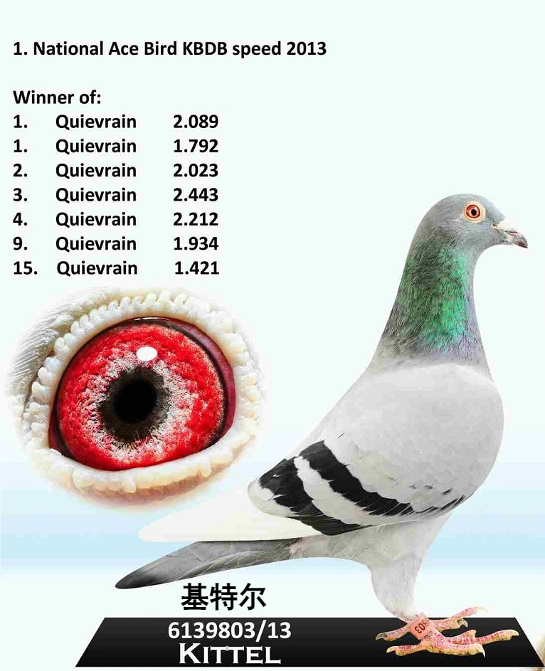 917母亲是吉尔特·海伦与凡登布克的结合,源于兰吉直子×超越基特尔。超越基特尔是基特尔最佳直子与晚生雌的结合。基特尔,13年KBDB全国速度鸽王冠军,晚生雌作出子代获9次冠军。其归属的凡登布克血系更是在开尔荣获10次冠军荣耀。