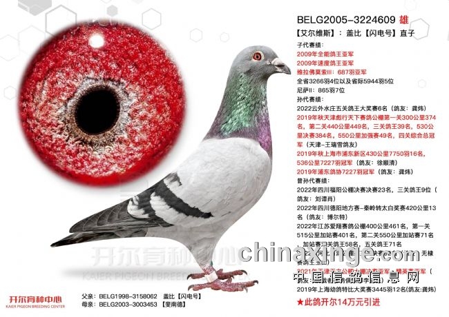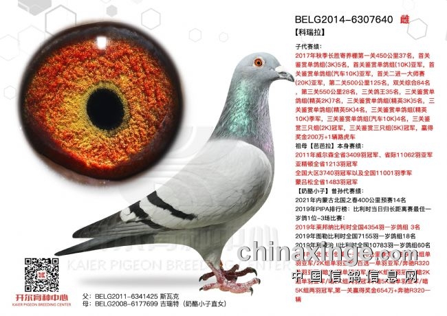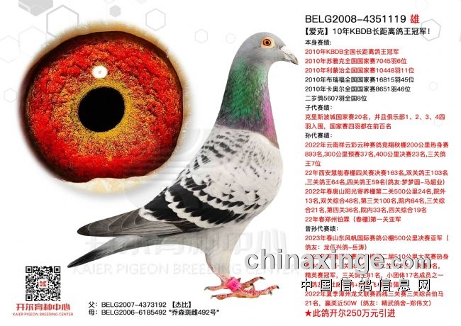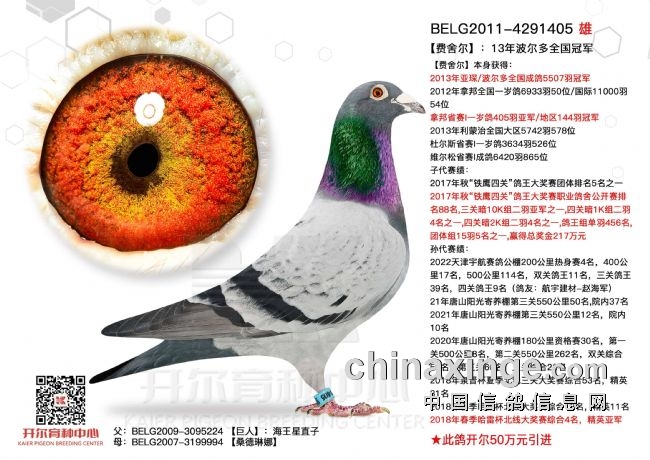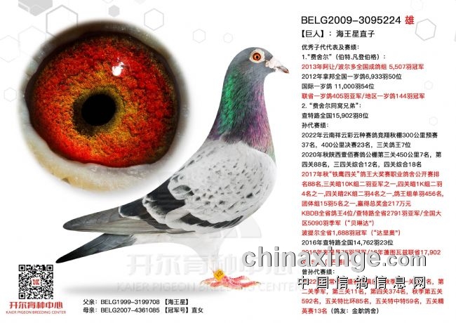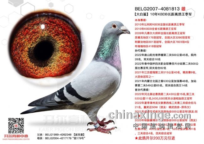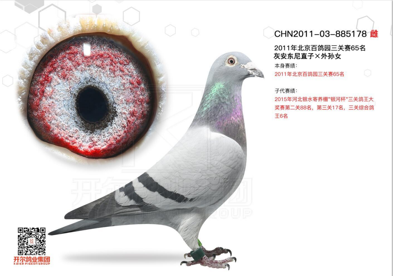 22名父亲837出自两羽鸽王的配对,837父亲源自大白鲨直子与爱克直女的结合,母亲出自灰安东尼直子×外孙女。