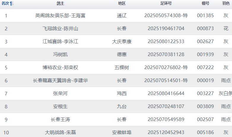 归巢消息:下午一点半左右,归巢的小将们为本次比赛再添高潮,英阁鸽友俱乐部-王海富的2025050574308灰,13:46:54打钟,飞行分速1283.7221米/分,获得冠军;飞冠鸽业-陈井山的2025190461704花获亚军,分速1282.2475米/分;江城赛鸽-李泳江的2025080122533灰获季军,分速1281.8028米/分。