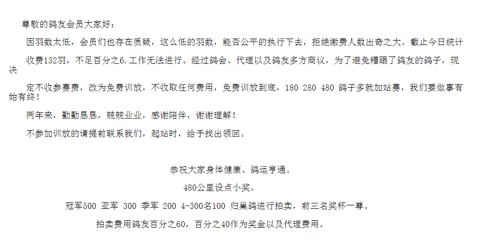 10月16日晚11点,山西一公棚发布公告:因收费站后缴费羽数太低,不足6%,以致工作无法正常进行。经过鸽会、代理以及鸽友多方商议,决定不收取参赛费,改为180公里、280公里、480公里免费训放。