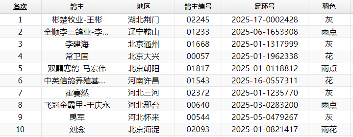 归巢消息:10点刚过,已有大批赛鸽归巢,彬楚牧业-王彬的2025-17-0002428灰,10:06打钟,飞行分速1565.0805米/分,获得冠军;全顺李三鸽业-李洪春的2025-06-1653308雨点获亚军,分速1564.6326米/分;李建海的2025-01-1317999灰获季军,分速1564.1308米/分。