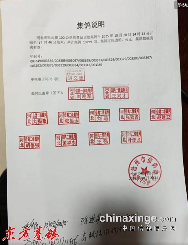 为了对每一位参赛鸽友负责,呵护每一羽参赛鸽,河北宏冠公棚秋赛百公里收费站前后历经三次集鸽,前两次皆都因司放地天气原因未能如期开笼。今天是第三次集鸽,天遂人愿,收获了比赛成功的喜悦。