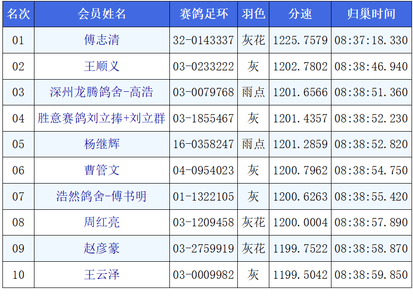 北京海淀傅志清麾下32-0143337灰花,于08:37:18.330入棚归巢,以1225.7579米/分速率先归巢获冠军;