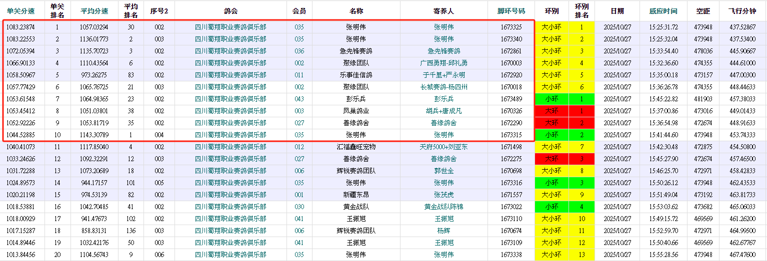 赛鸽1673325率先踩钟,分速1083.2387米/分,实际空距473.948公里,斩获本关冠军;另一羽赛鸽1673340紧随其后,分速1083.2255米/分,获得亚军荣誉,同时,这羽亚军鸽还在综合赛中暂排鸽王亚军!