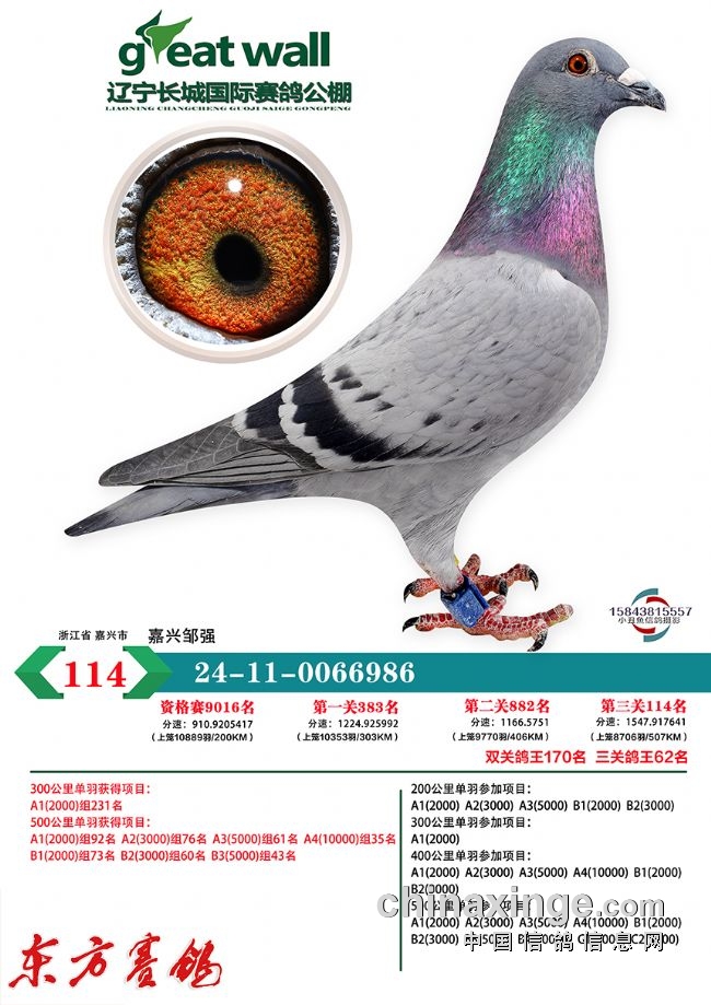 2025年唐山开尔大春棚预赛109名,加站赛12名(三关鸽王亚军,四关鸽王季军,五关鸽王殿军)