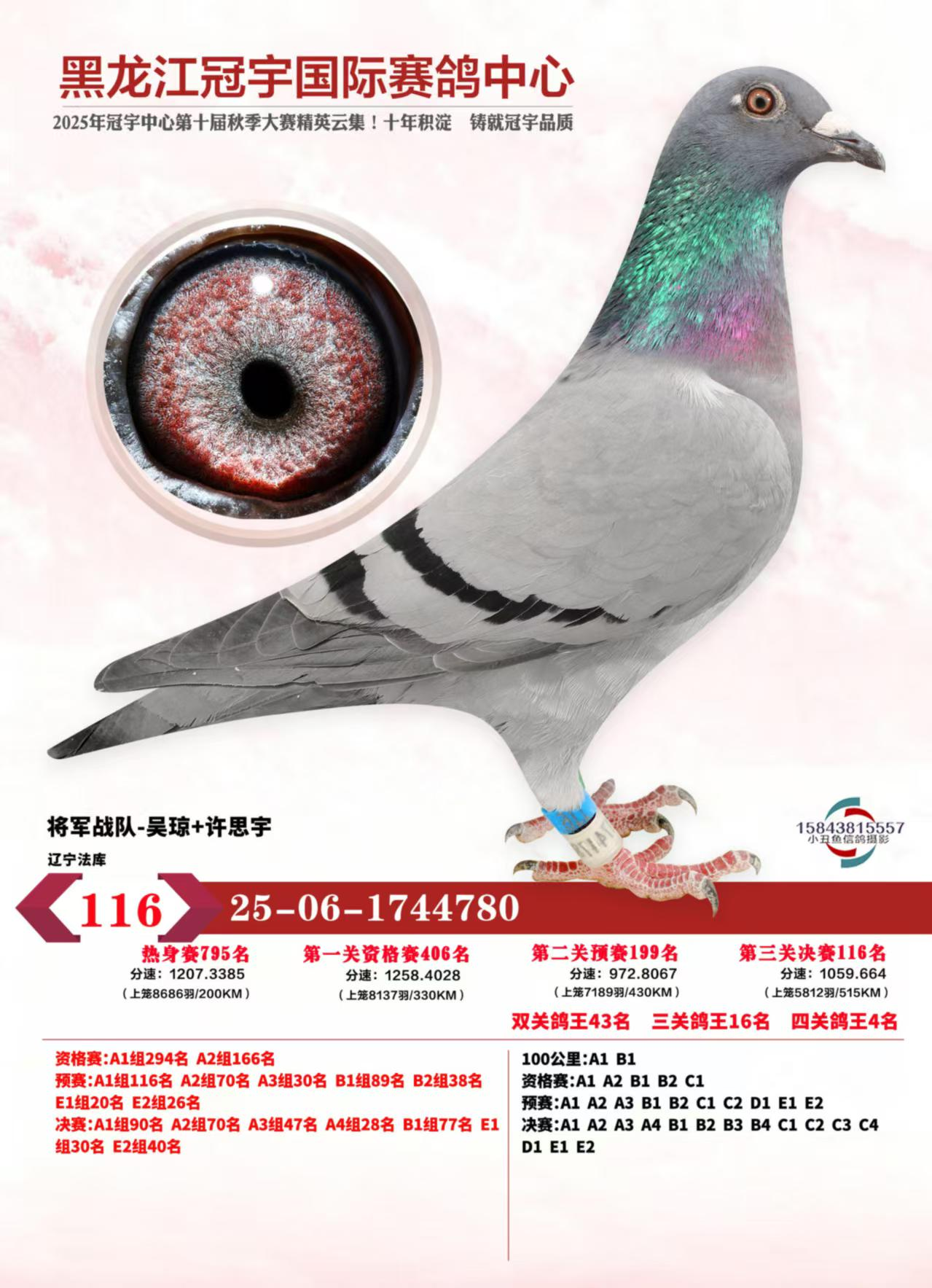 恭喜鸽友将军战队-吴琼+许思宇旗下小将斩获冠宇公棚四关鸽王殿军!殿军父亲098出自开尔育种中心,源自速度红魔海伦家族!