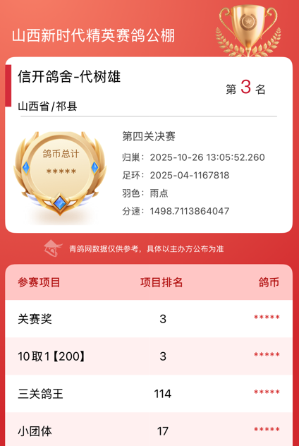 恭喜鸽友信开鸽舍-代树雄,斩获山西新时代精英赛鸽公棚决赛季军!季军父亲109源自开尔育种中心,盖比鲁迪直子与直女近亲回血之作。
