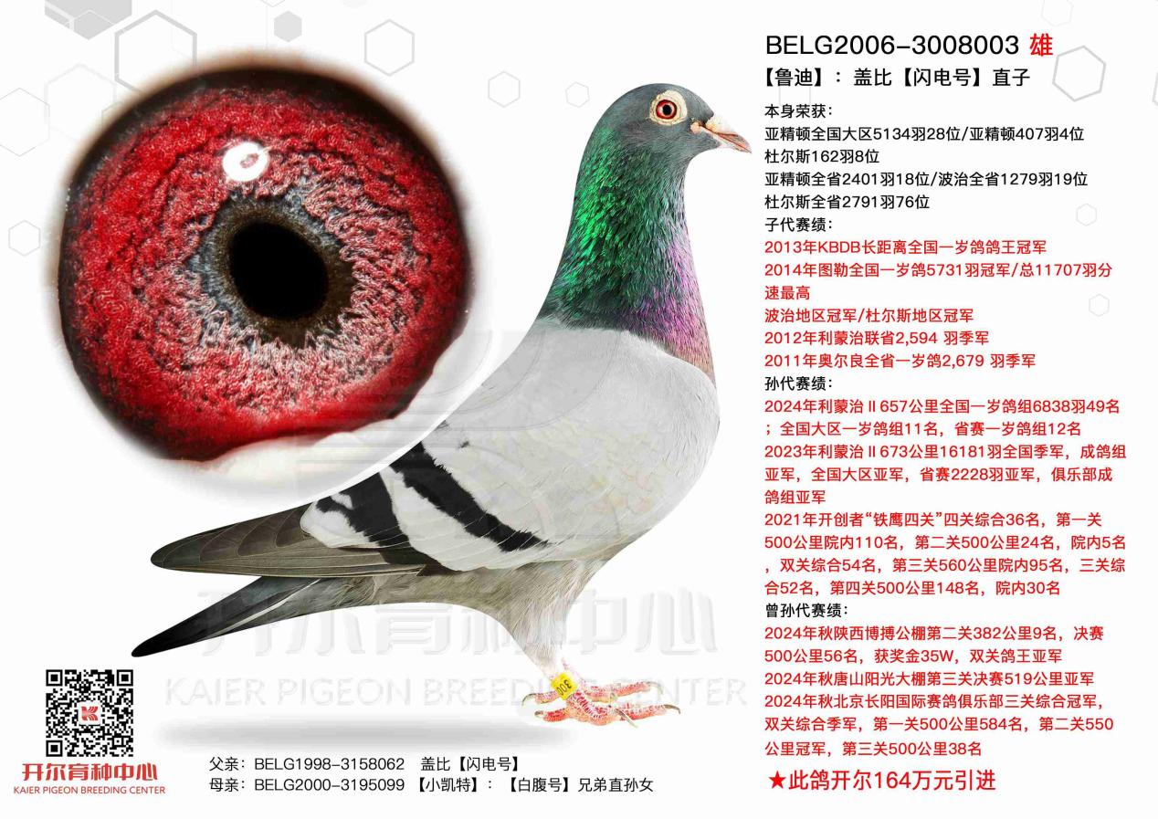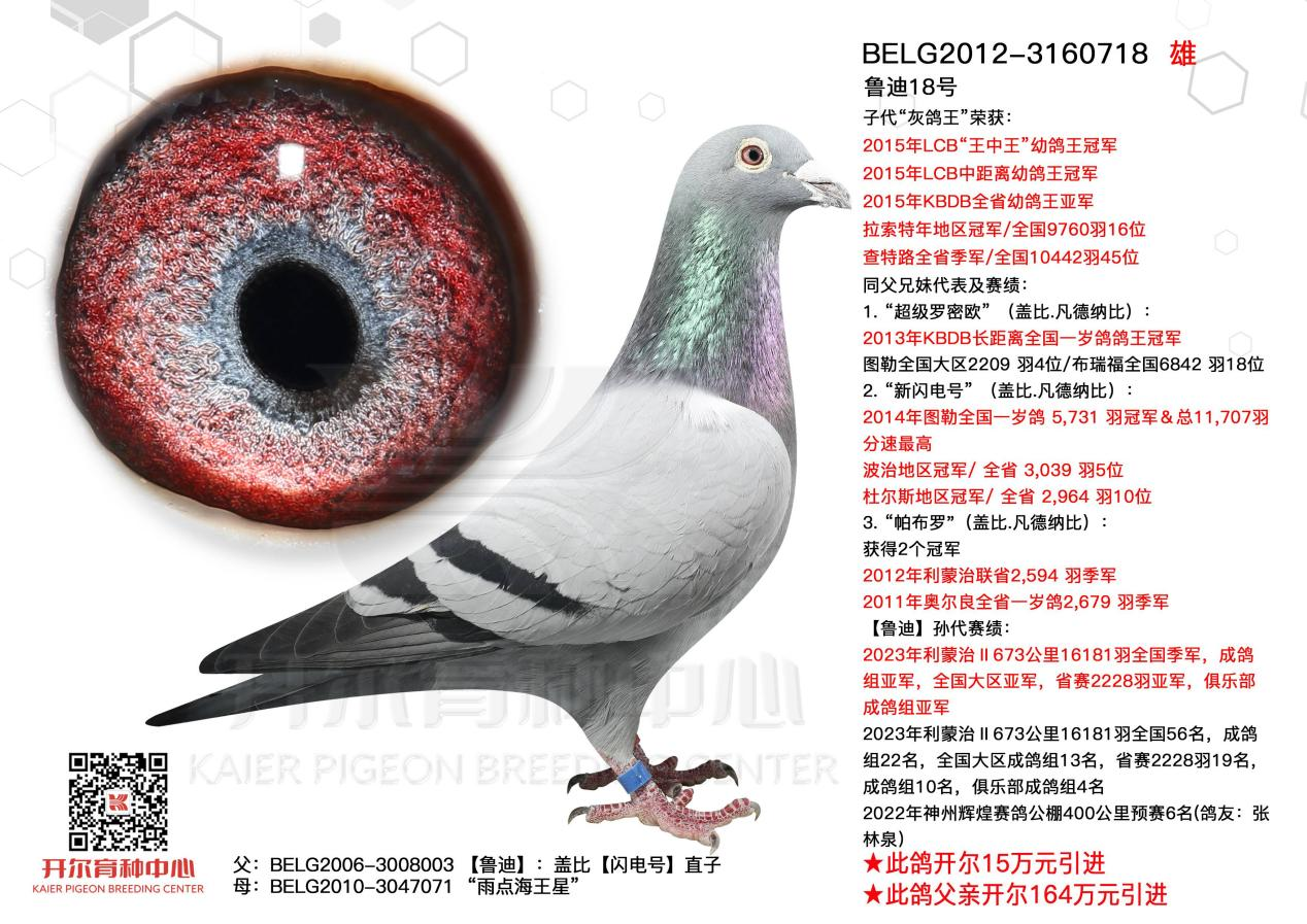 鲁迪是开尔盖比品系代表种鸽,父亲是盖比大名鼎鼎的闪电号,母亲是小凯特雌,亲姐妹小碧斩获7次冠军,鲁迪自身斩获亚精顿、波治、杜尔斯等多场赛事的前奖高位,作育子代超级罗密欧、新闪电号、皮克等,家族后代依旧征战赛场、闪耀鸽坛。