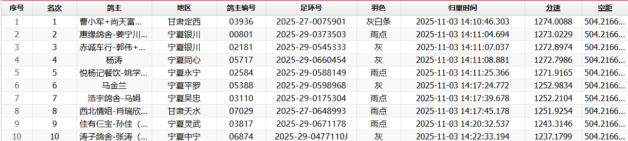 下午14点10分,首羽赛鸽归来!曹小军+尚天富(Y)名下的赛鸽2025-27-0075901(灰白条),以1274.0088米/分的速度成功夺得本场冠军,飞行空距达504.216公里。紧随其后,惠缘鸽舍-姜宁川(Y)的2025-29-0373503(雨点),以1273.0229米/分的分速斩获亚军。季军由赤诚车行-郭伟+张岩(Y)摘得,赛鸽环号2025-29-0545333(灰鸽),平均分速1272.8974米/分。