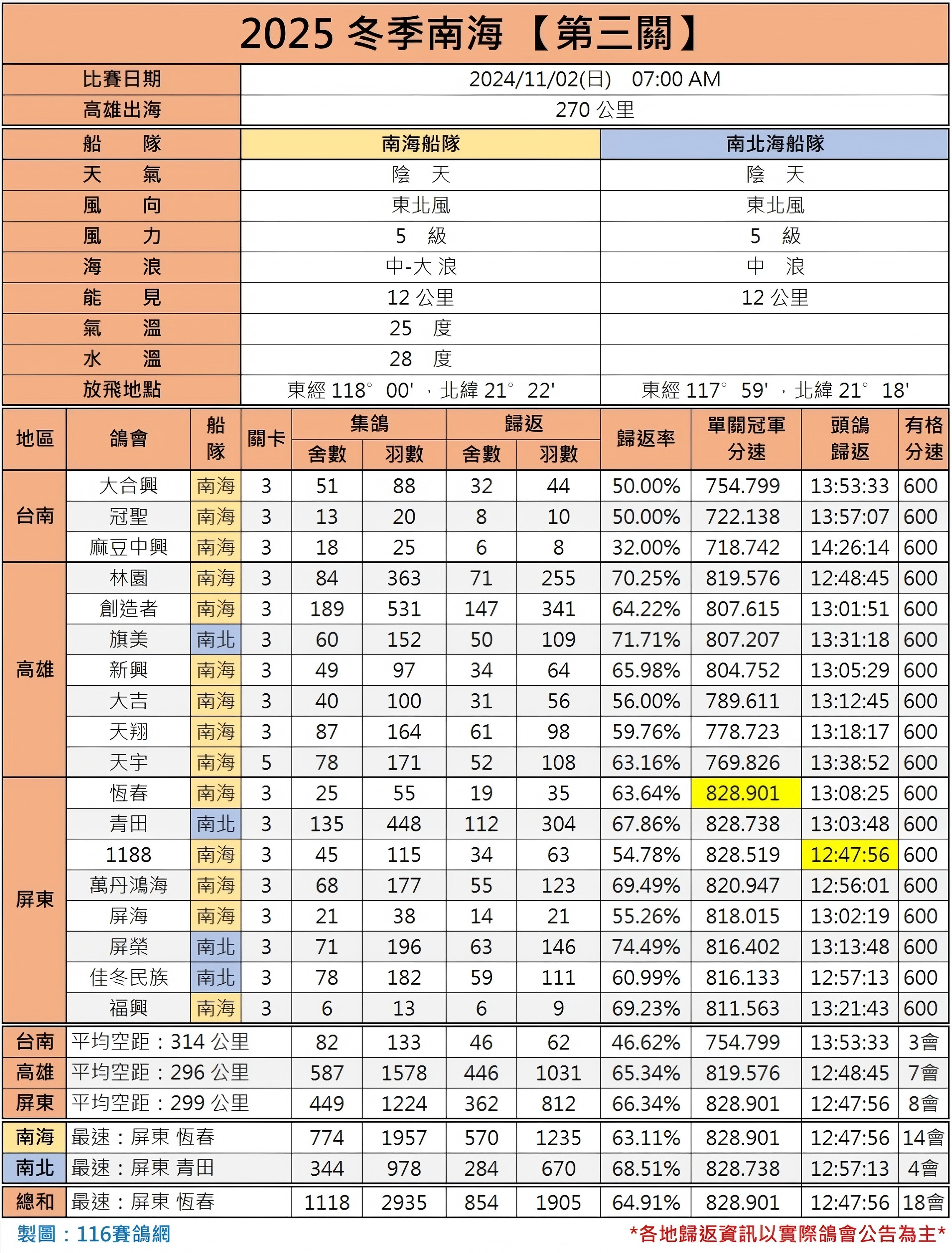 11月2日,中国台湾南海冬季第三关比赛打响。早晨7时整,比赛在高雄出海270公里处开笼,共集鸽18会1118舍2935羽赛鸽。