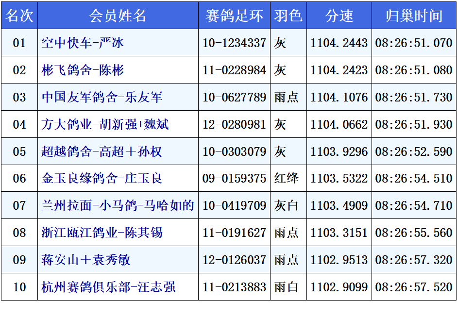 安徽灵璧县鸽友空中快车-严冰麾下10-0679135灰于08:26:51.07率先踏响鸽钟拔得头筹,分速为1104.2443米/分;浙江嘉兴市彬飞鸽舍-陈彬麾下11-0228984灰和江苏常州市中国友军鸽舍-乐友军名下10-0666544雨点分列二、三名。