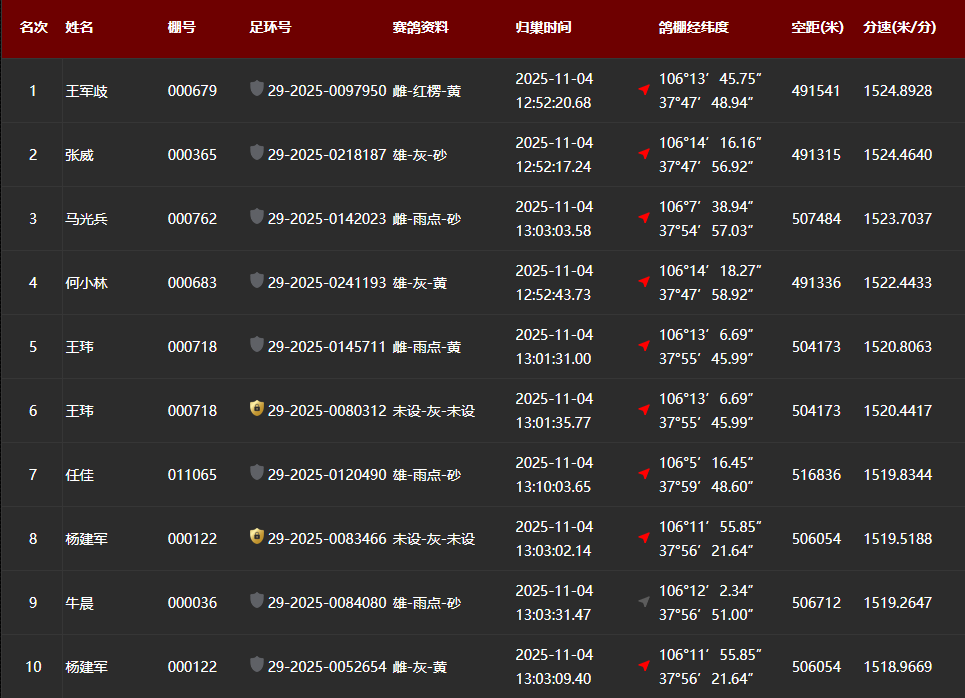 12时52分20秒,鸽友王军歧的29-2025-0097950黄眼红楞雌鸽报进,空距491.541公里,分速1524.8928米/分,获得本关冠军!该鸽友的赛鸽团队在266公里的资格赛时就表现出色,拿下了万羽赛的亚军与殿军,爆发力与耐力具佳。