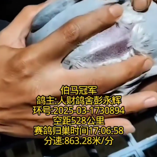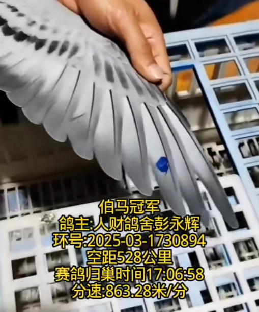 11月6日早6点55分,河间浩友赛鸽俱乐部秋季第三关500公里,在河南商丘市拓城县司放299羽,参考空距500公里。当日仅一羽赛鸽归巢,获得伯马冠军。这羽赛鸽来自人财鸽舍彭永辉的03-2025-1730894,于飞行十多个小时后,于当天下午17点06分打钟归巢,飞行分速863.2836米/分。直播链接>>