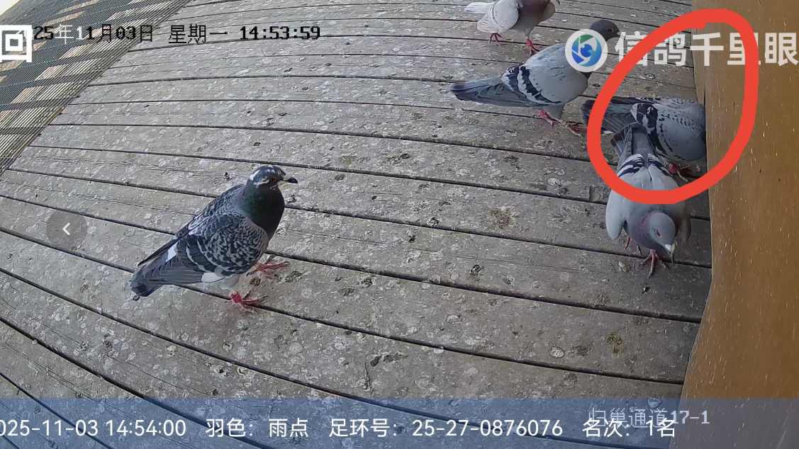 当日下午14点54分,甘肃酒泉鸽友刘国金+冠军梦名下一羽雨点赛鸽率先归巢,以1238.1130米/分的成绩摘得桂冠,足环号为25-27-0876076。截止有效报到时间,共有3177羽赛鸽顺利归巢,归巢率接近五成。