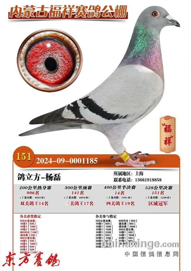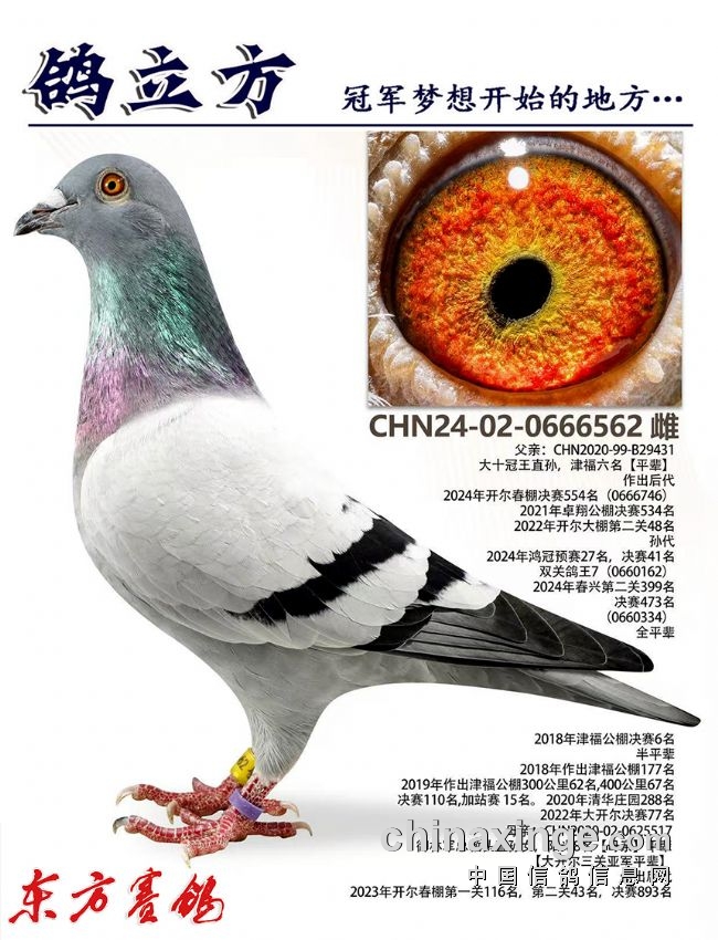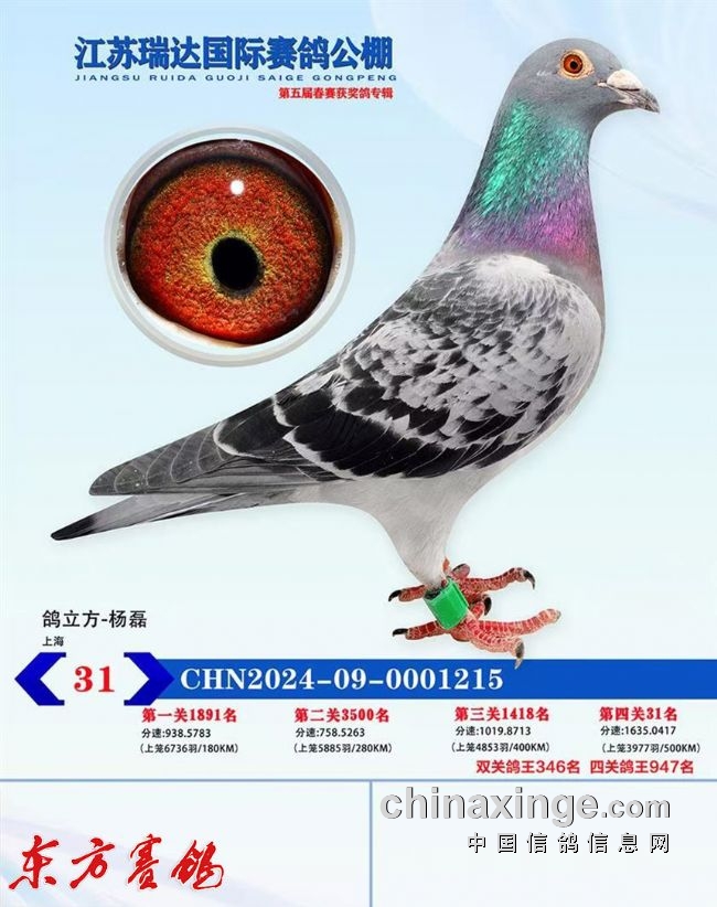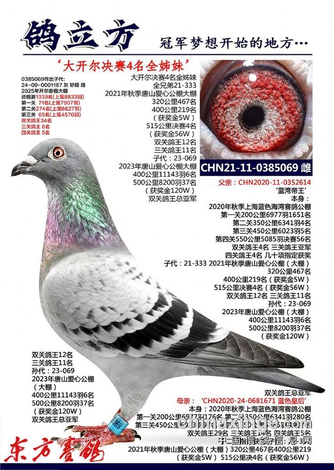 2025年开尔爱心公棚(大春棚)决赛65名,开尔大春棚第一关71名、第二关274名、双关鸽王34名、三关鸽王6名、四关鸽王5名;2025年江苏瑞达国际赛鸽春棚决赛31名;内蒙古福祥赛鸽公棚决赛151名(区域冠军)。
