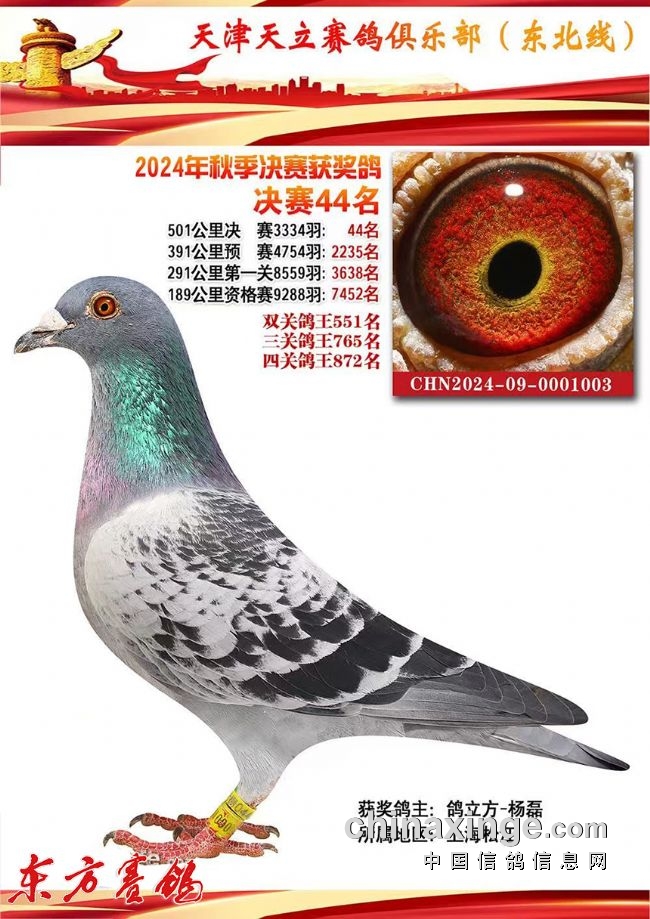 2024年开尔大棚180km124名、187名;山东沂蒙赛鸽春棚决赛8名;开尔大春棚决赛18名、375名;神州辉煌决赛223名(精英赛60名)、200公里259名。辽宁长城资格赛275名;开尔青年队预赛187名;金谷决赛399名;天龙公棚预赛225名300km,202名;天津天立公棚决赛44名;上海蓝色海湾首关87名。