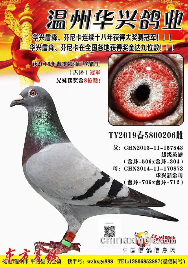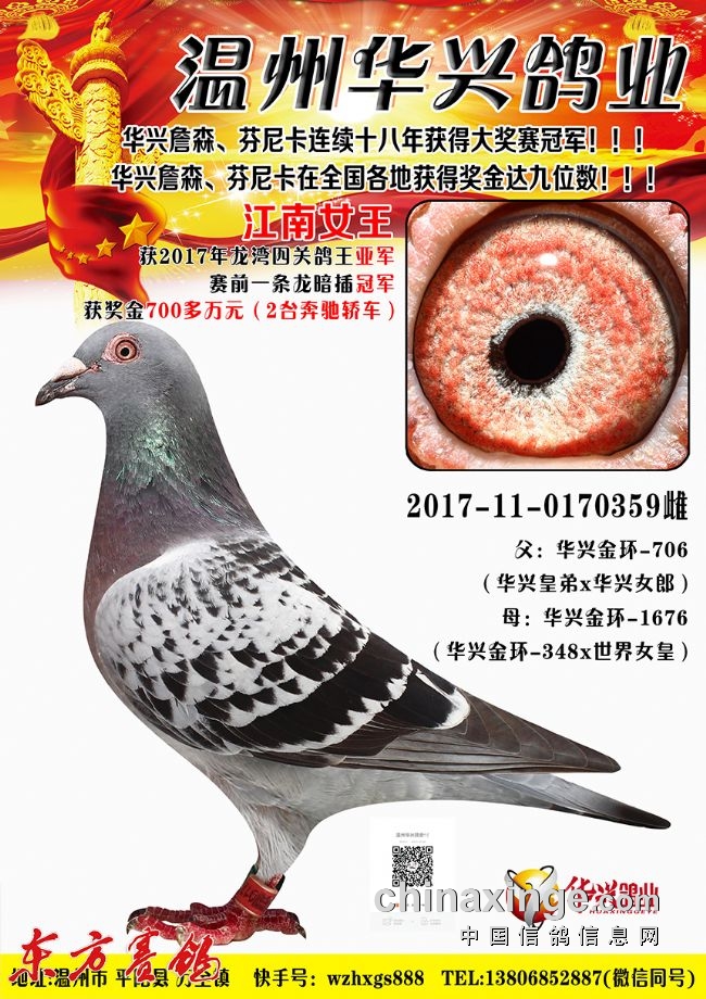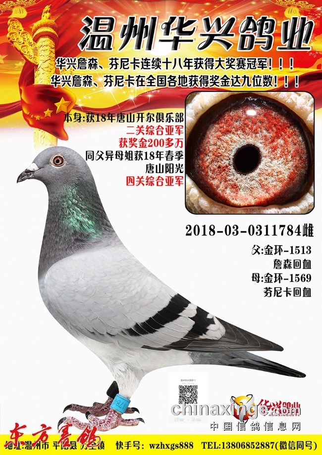 血系:他通过自己几十年对鸽子性格的摸索,也根据自己舍内种鸽赛鸽有机地溶血培育,以世界锦标赛9名“华兴皇帝”(詹森麦克斯系)和世界锦标赛总冠军“世界女皇”(芬尼卡血系)为代表,创造了华兴血系。创建“华兴詹森、华兴芬尼卡”系、以“王子爸爸”“华兴女郎”“华兴506”“华兴712”作为本舍始祖,通过子代、孙代、曾孙代、代代冠军“比赛--繁殖--引进--改良”的循环过程,他的华兴系列已经作育了十代冠军。