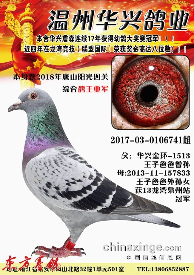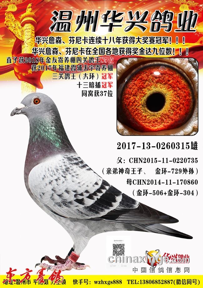2017年获唐山开尔寄养棚院内外总冠军;福建霞浦天宇杯秋赛决赛四关综合鸽王:季军、5、10、14、28、32名等;福建霞浦天宇杯春赛决赛三关综合鸽王:亚军、季军、10、15、17、27名等;秋季温州龙湾(国际联盟)四关综合鸽王:亚军、5、6、9、11、12、22名等。