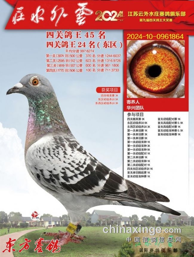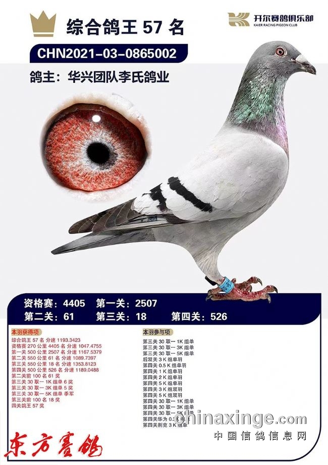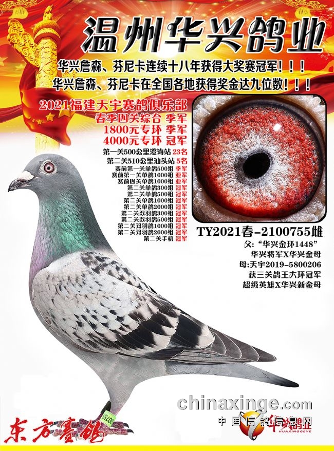 2021年秋季华兴团队喜获龙湾四关鸽王总冠军、季军、4、6、10、11、17、18、19等,江苏灵峰寄养棚四关鸽王39、52位;唐山开尔俱乐部四关鸽王52、57位等,福建霞浦天宇寄养棚四关鸽王(大环)冠军、5、7、10、11、14名等。