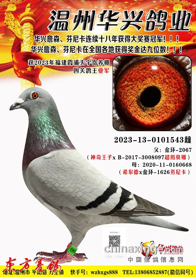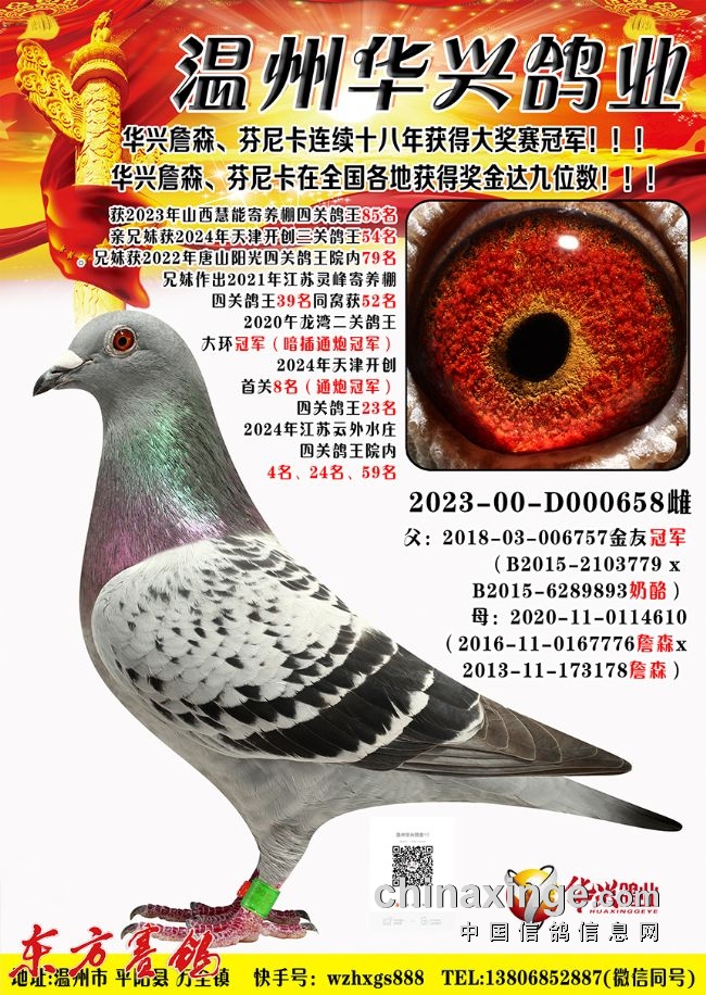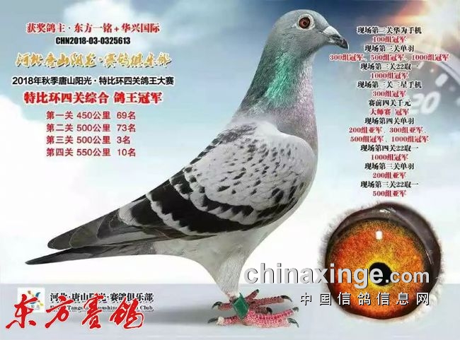 2023年秋季获唐山阳光寄养棚四关鸽王大奖赛团体亚军、4羽进奖(购环10枚)院内24名、58名、96名、143名;西安慧能俱乐部,院内四关综合28、85名;福建霞浦天宇寄养棚获团体冠军四关综合鸽王亚军、9名、11名等;
