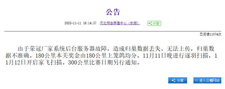 就在比赛当日下午16点,河北明会公棚官网发布一则声明称:由于荣冠厂家系统后台服务器故障,造成归巢数据丢失、无法上传,归巢数据不准确。180公里本关奖金由180公里上笼鸽均分。