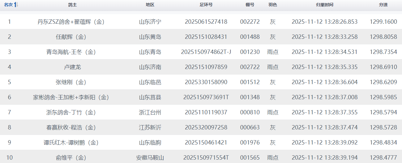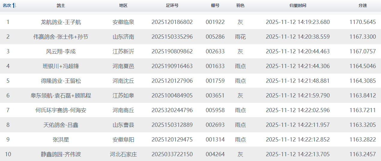 归巢消息:山东商河鸽友张小梅+张恒斌名下一羽2025150185486雨点赛鸽,于13:12:09 率先归巢,以1500.1059米/分的高分速斩获决赛冠军;河南漯河雷军民的赛鸽 2025160517326紧随其后,13:12:42归巢,分速1497.7203米/分,拿下亚军。