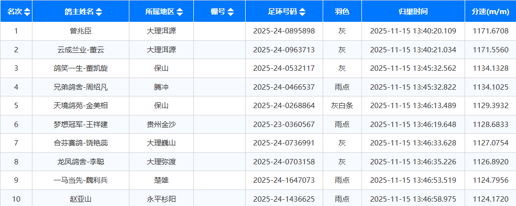 冠军:鸽友曾兆臣的一羽2025-24-0895898灰,于下午13:40:20归巢,分速1171.6708米/分,斩获冠军。
